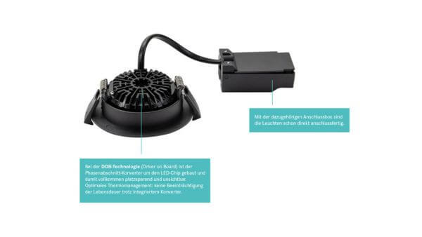 Mit modernster DOB-Technologie (Driver on Board) bieten die neuen Einbaustrahler von Brumberg eine besonders kompakte Bauweise, da der Konverter unsichtbar direkt am LED-Chip integriert ist. Das spart Platz und ermöglicht vielseitige Einsatzmöglichkeiten – von Wohnräumen bis hin zu Feucht- und Außenbereichen.