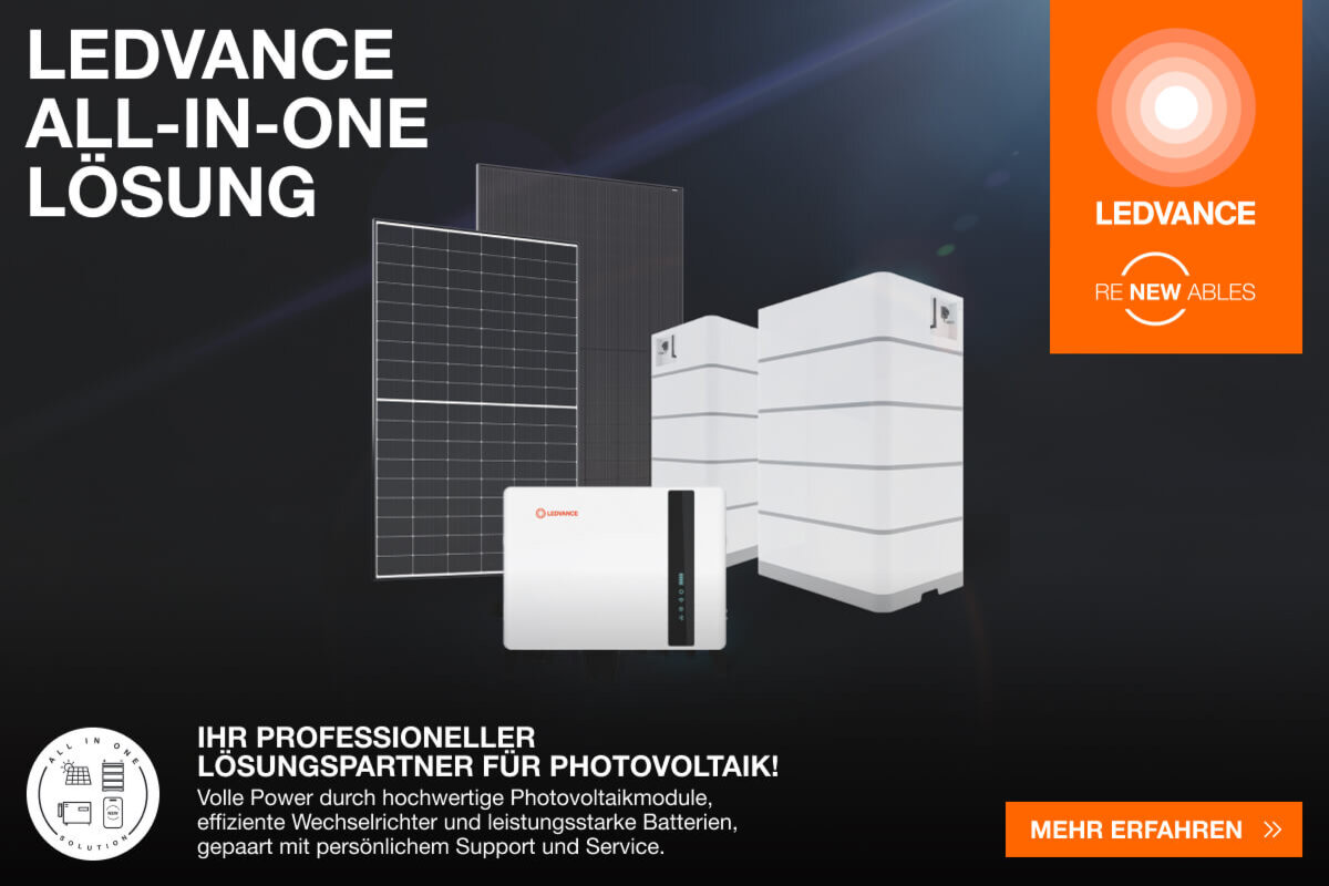 Im Einklang mit der globalen Initiative, bis 2050 klimaneutral zu sein, präsentiert LEDVANCE sein neues Produktportfolio, das sich den dringenden Herausforderungen des Klimawandels stellt. LEDVANCE Renewables, das seit 2023 auf den Markt ist, integriert Photovoltaikmodule, Wechselrichter und Batteriespeicher in ein umfassendes System. Das Besondere an dieser Lösung ist das Bündelangebot für alle Hauptkomponenten einer Photovoltaikanlage, die Kunden eine bequeme Möglichkeit bietet, alles aus einer Hand zu beziehen.